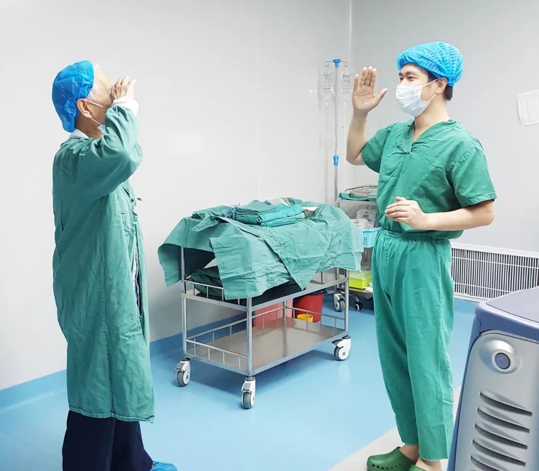 2018年教师节,手术结束后,胡老在手术室和罗维骁院长的双向敬礼