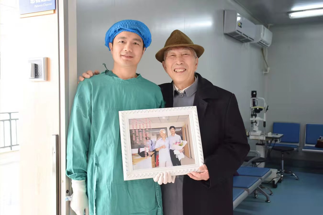 胡老亲手将相框赠予罗维骁院长,相框里的合影,是2018年第一次白内障手术后两人的珍贵留念