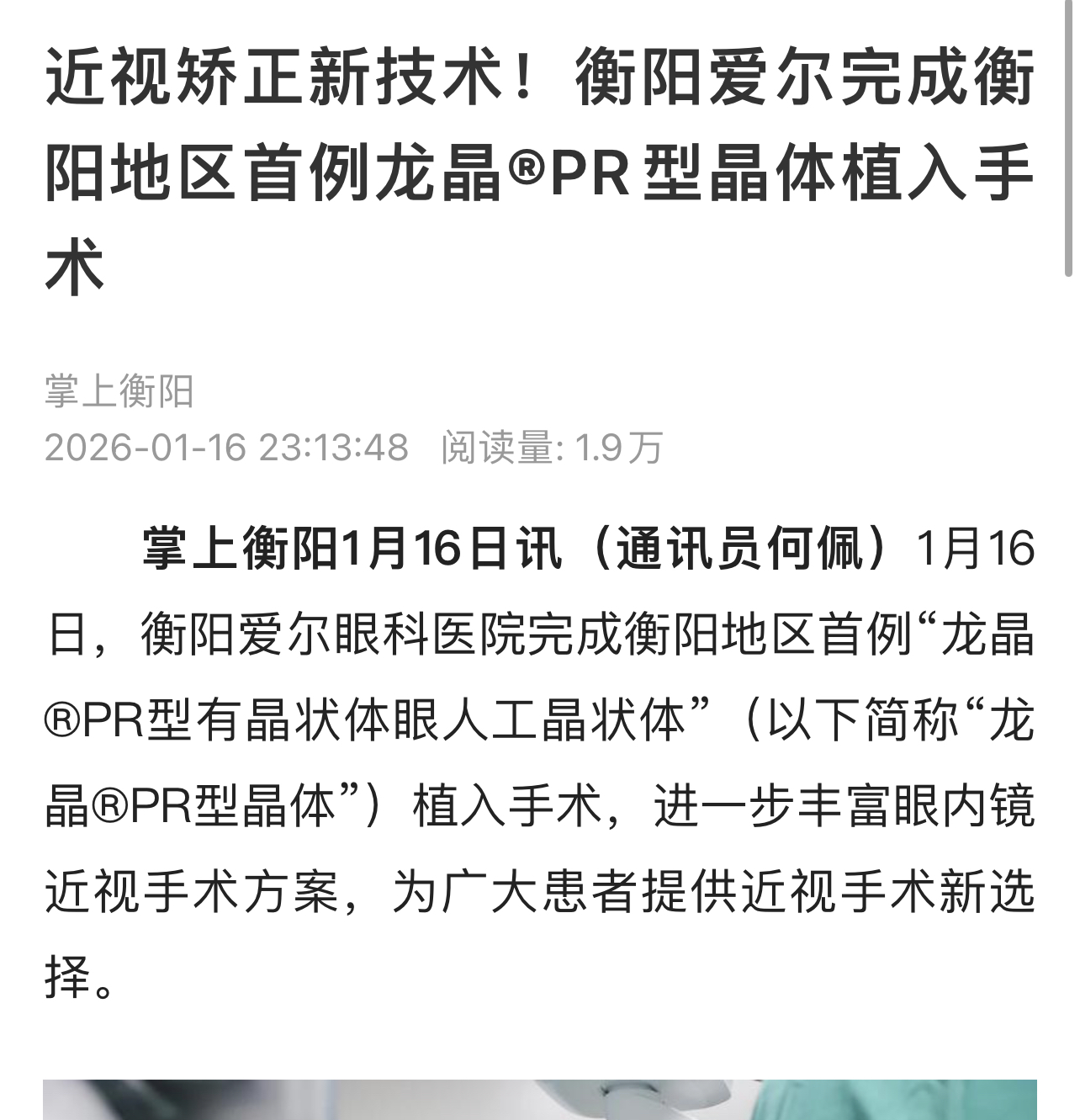 2026年1月16日,衡阳爱尔眼科医院完成“龙晶®PR型有晶体眼人工晶状体”(以下简称“龙晶®PR型晶体”)植入手术,进一步丰富眼内镜近视手术方案,为广大患者提供摘镜方案新选择。