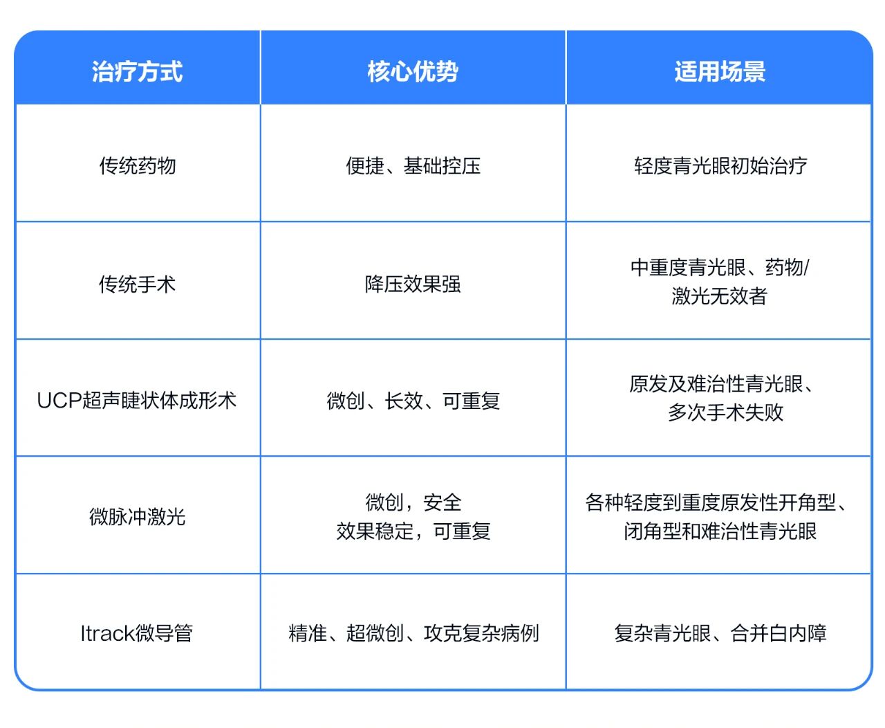 随着一些微创治疗新技术,如UCP超声睫状体成形术、微脉冲、Itrack微导管等技术出现,治疗手段得到进一步升级。