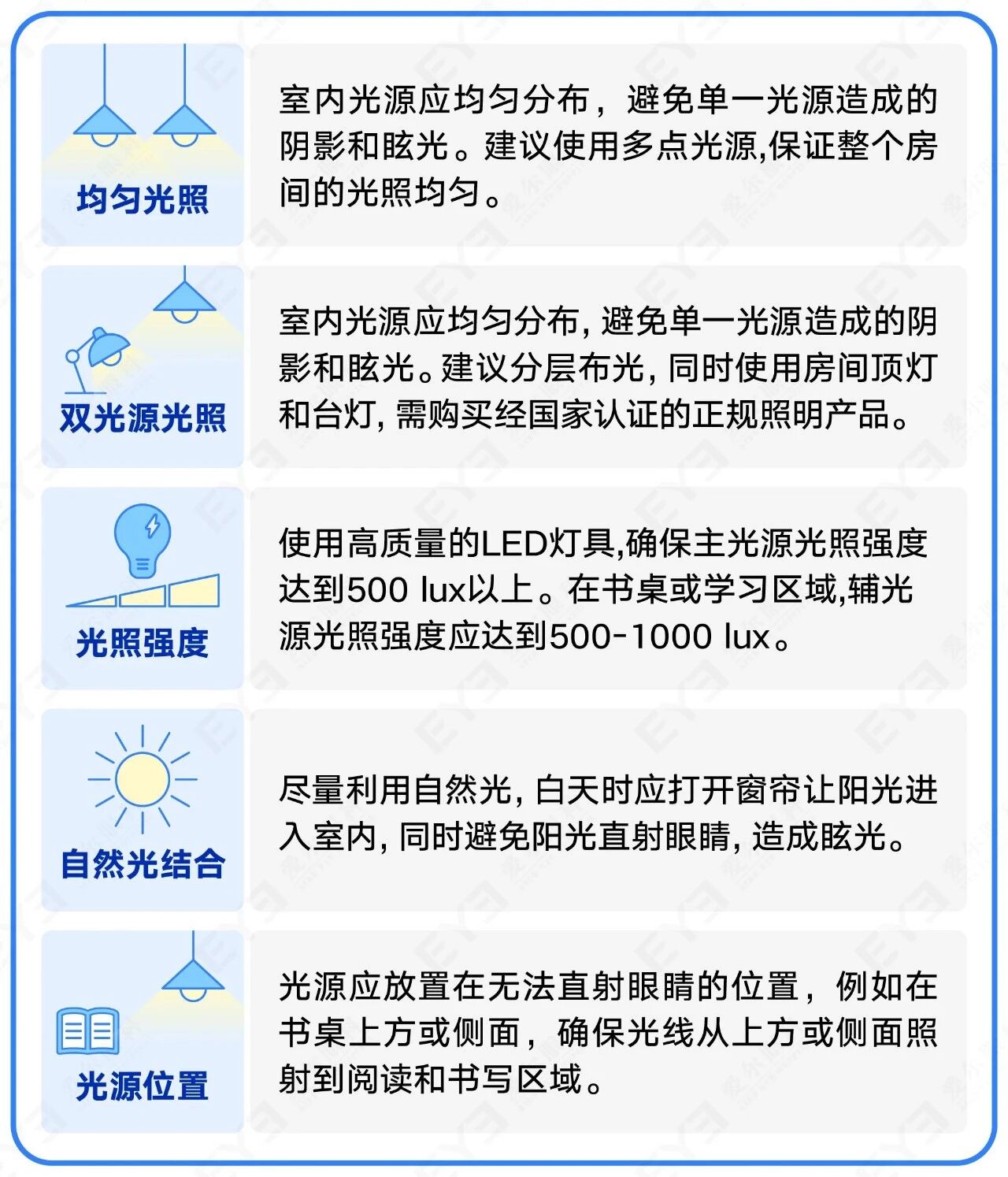 1、打造“科学护眼光源”:给孩子准备一盏护眼台灯,放置在书桌的左前方,避免光线直射眼睛或在书本上形成反光。同时,要打开房间的主灯,形成“台灯+主灯”的双光源照明,让环境光线充足且柔和。