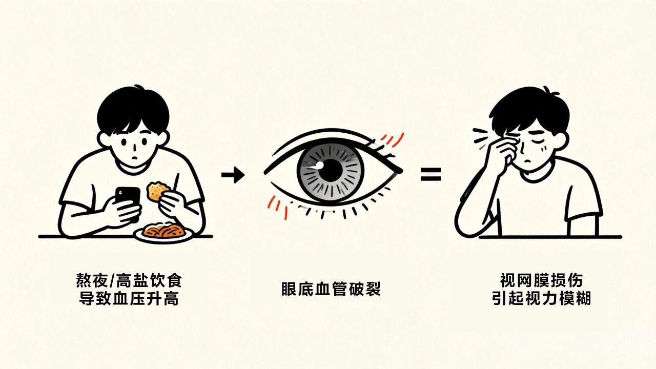 高血压对眼睛的伤害,一开始往往是无声无息的——眼底的视网膜、脉络膜等组织有着非常丰富的血管,血压长期偏高,会让这些血管逐渐变硬变窄,发生渗出甚至破裂出血,就像生锈的水管,水流不畅、不堪重负,从而引发高血压性视网膜病变、视网膜血管阻塞等一系列眼底病变,导致视力下降。